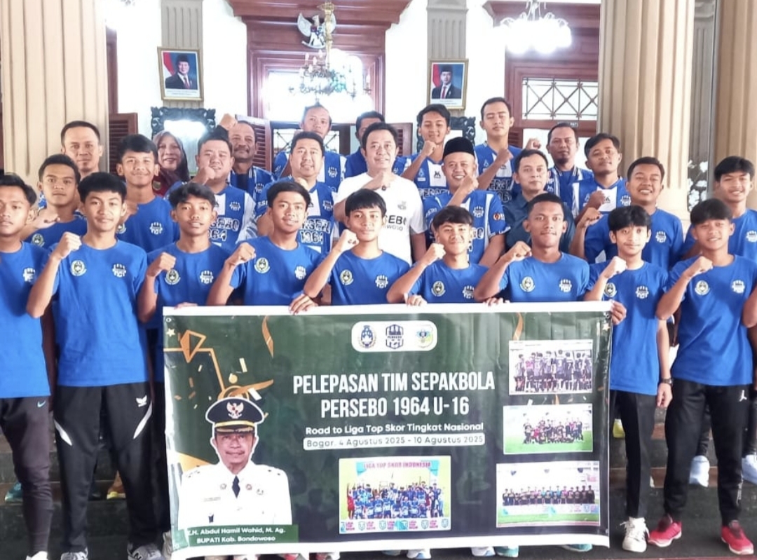 Bondowoso, JEJAKPERISTIWA.CO.ID – Dengan penuh semangat dan harapan tinggi, tim sepak bola U-16 Persebo 1964 resmi dilepas Bupati Bondowoso Abdul Hamid Wahid untuk berlaga di ajang Liga Top Skor di Bogor, Jawa Barat. Acara pelepasan berlangsung di Pendopo Kabupaten pada Jumat (1/8/2025) dan diwarnai suasana akrab serta motivasi yang menggelora.