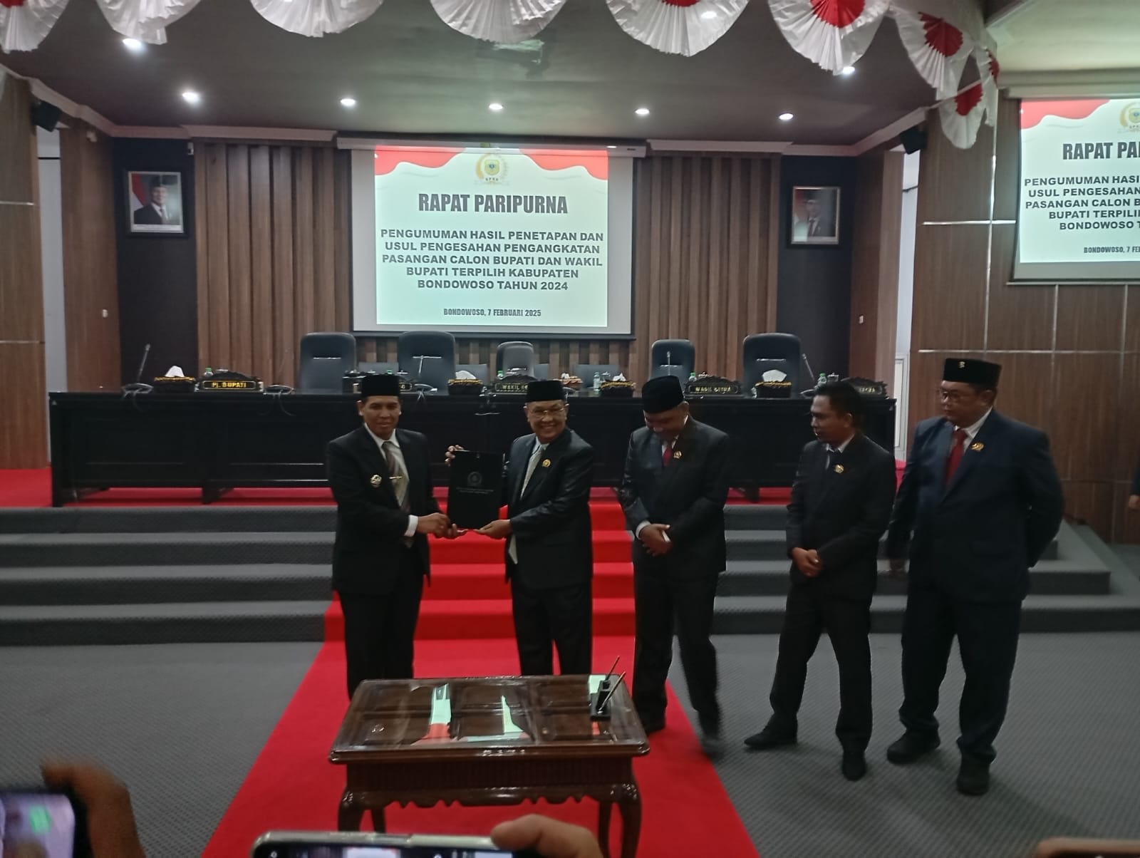 “Secara bersama-sama Menyatakan bahwa berdasarkan Keputusan KPU Kabupaten Bondowoso Nomor 1 Tahun 2025 tentang Penetapan Pasangan Calon Bupati dan Wakil Bupati Terpilih Kabupaten Bondowoso Tahun 2024 tanggal 6 Februari 2025, Sdr. H. ABDUL HAMID WAHID, M.Ag dan Sdr. AS’AD YAHYA SYAFI’I, SE telah ditetapkan Pasangan Calon Bupati dan Wakil Bupati Bondowoso Terpilih Tahun 2024- 2029” Ujar Ketua DPRD Ahmad Dhafir.