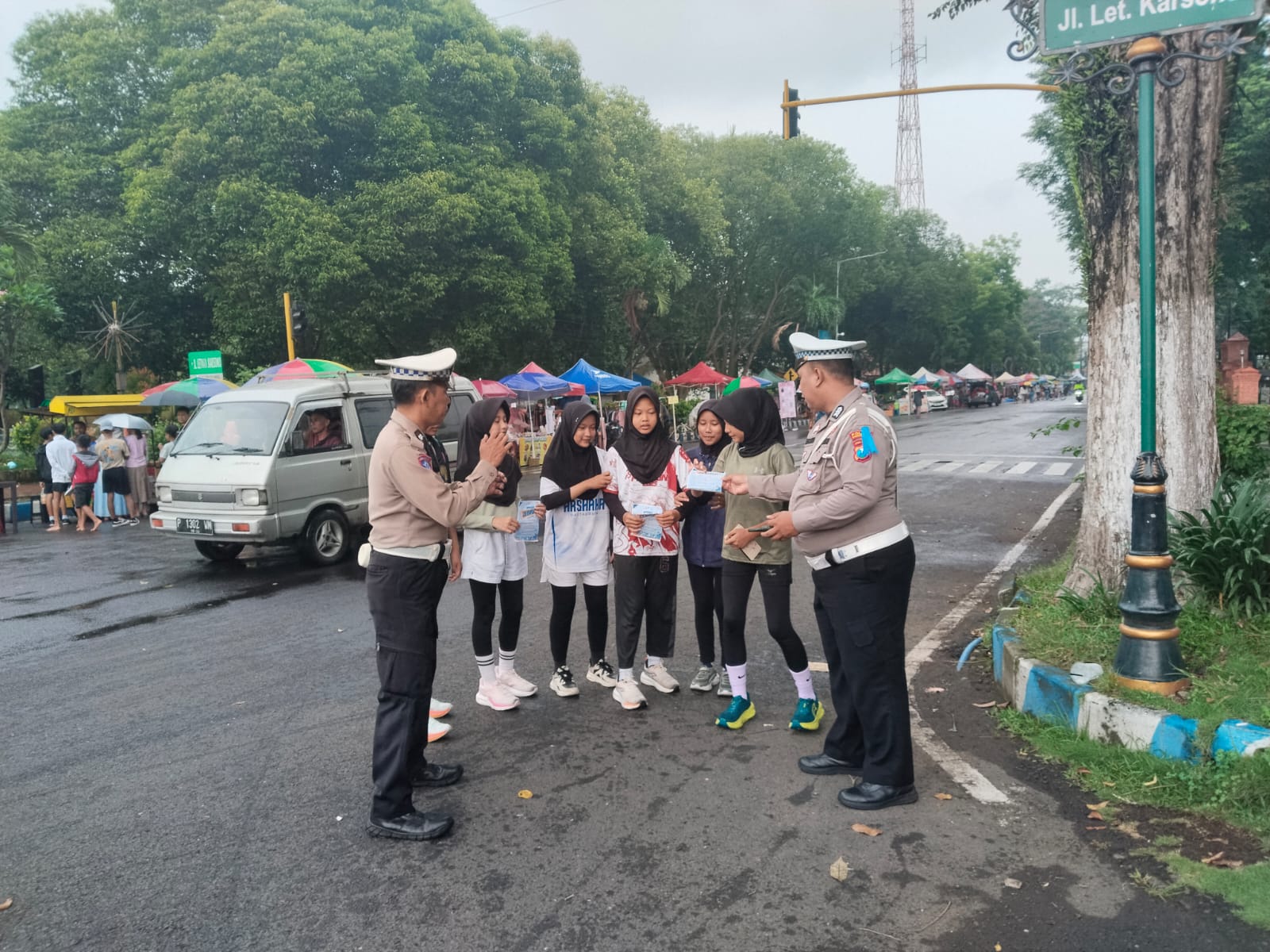 Selain edukasi, Polantas juga membagikan brosur keselamatan berkendara, melakukan tanya jawab interaktif, dan mengajak masyarakat berkomitmen menjadi pelopor keselamatan berlalu lintas. Suasana kegiatan berlangsung ramah, komunikatif, dan penuh kegembiraan.